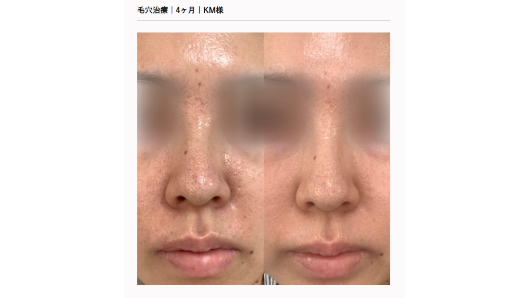 治療前と比較して、毛穴の開きやざらつきが改善し、肌全体がなめらかで引き締まった印象になっていますね!特に鼻や頬の毛穴が目立ちにくくなり、肌表面のキメが整ってきていて素晴らしいです。